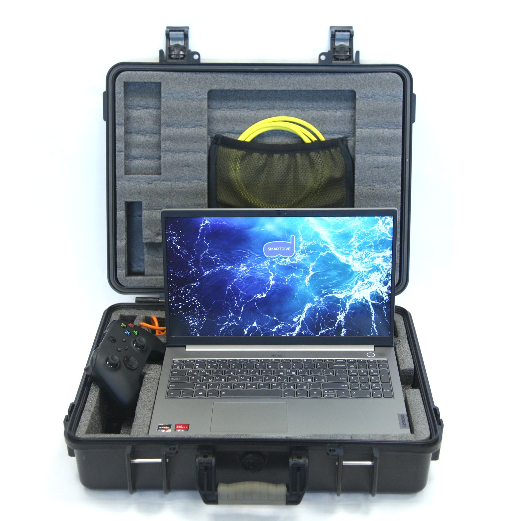 Мобильное рабочее место оператора (также возможна поставка без него) Портативный компьютер с ярким экраном в ударопрочном влагозащищённом кейсе – 1 шт. Программное обеспечение для управления ТПА Смартдайв предустановлено на компьютер. Управление подводным аппаратом происходит по интерфейсу Ethernet. Беспроводной джойстик управления – 1 шт. Очки виртуальной реальности (опционально)