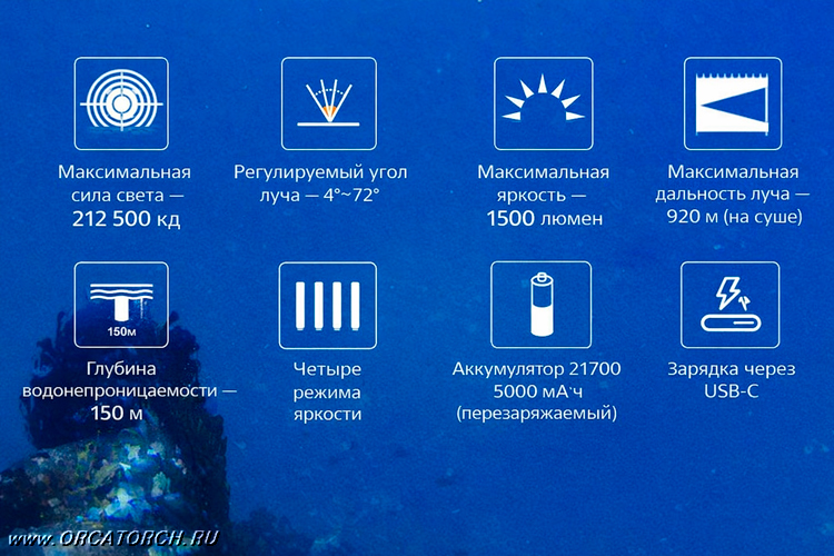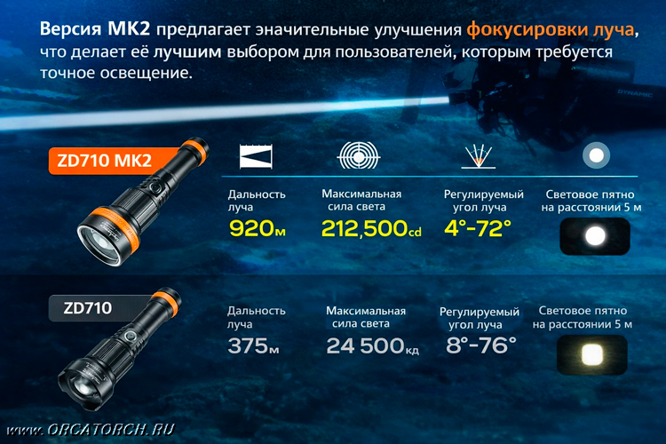 OrcaTorch ZD710 - это фокусируемый подводный фонарь с лучом 4~72°, благодаря минимальной боковой засветки и равномерному свету, достигается высокая ровная яркость центрального пятна.