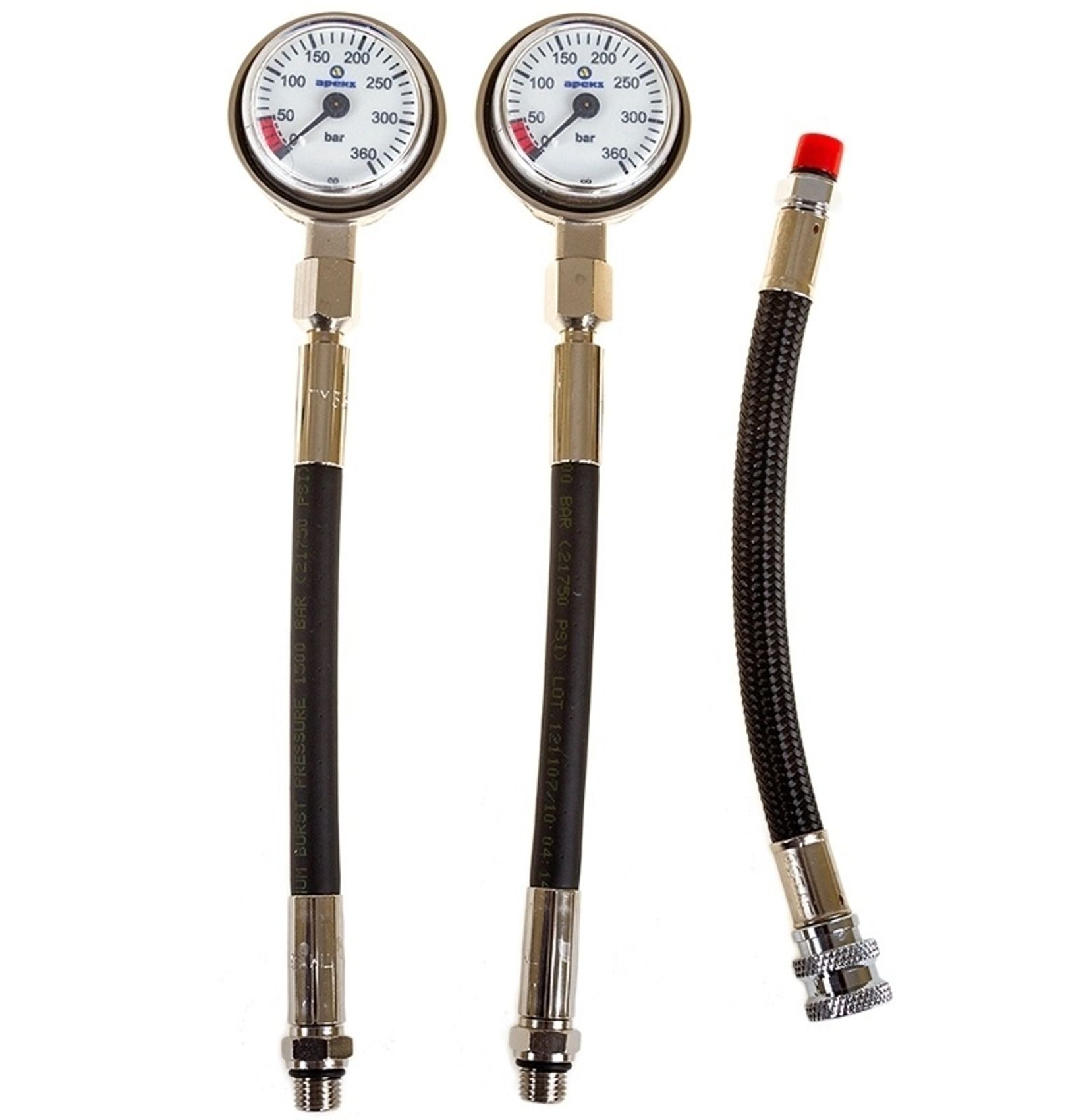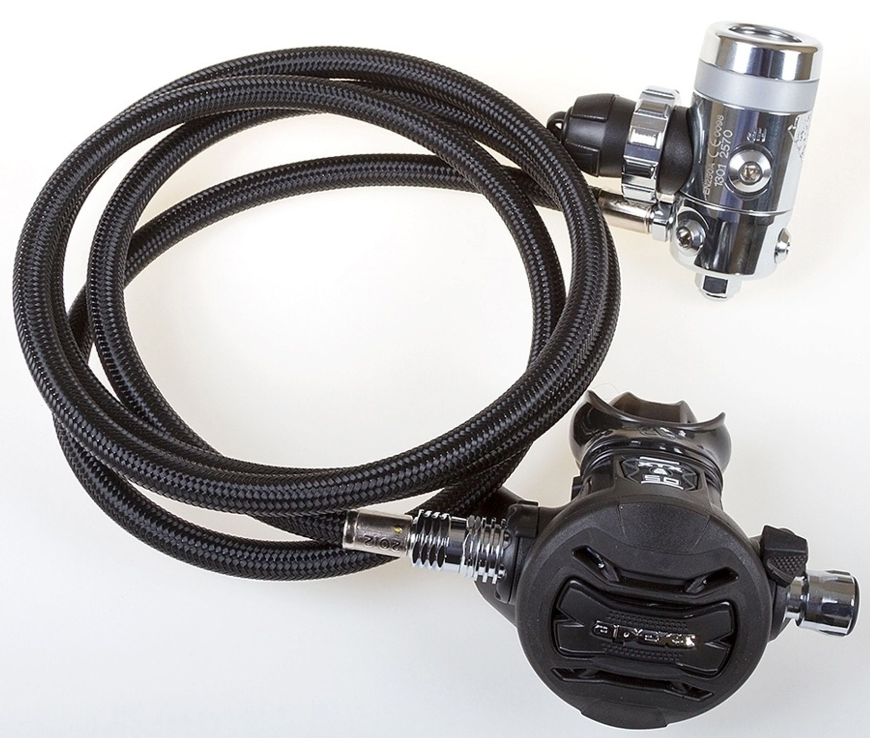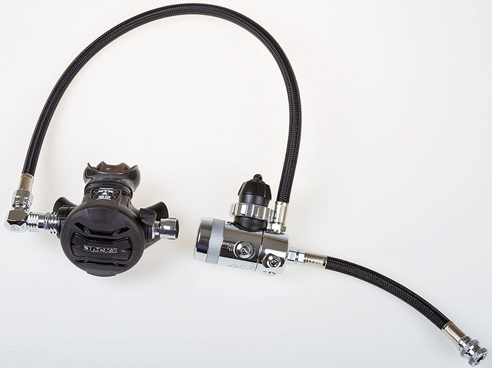 Состоит из двух первых ступеней DST с установленным пятым портом, двух вторых ступеней XTX50, одного стандартного шланга второй ступени (с угловым соединением) и одного двухметрового шланга; двух манометров на укороченном шланге и двух коротких шлангов поддува компенсатора. Все шланги имеют новую прочную оболочку AquaFlex.