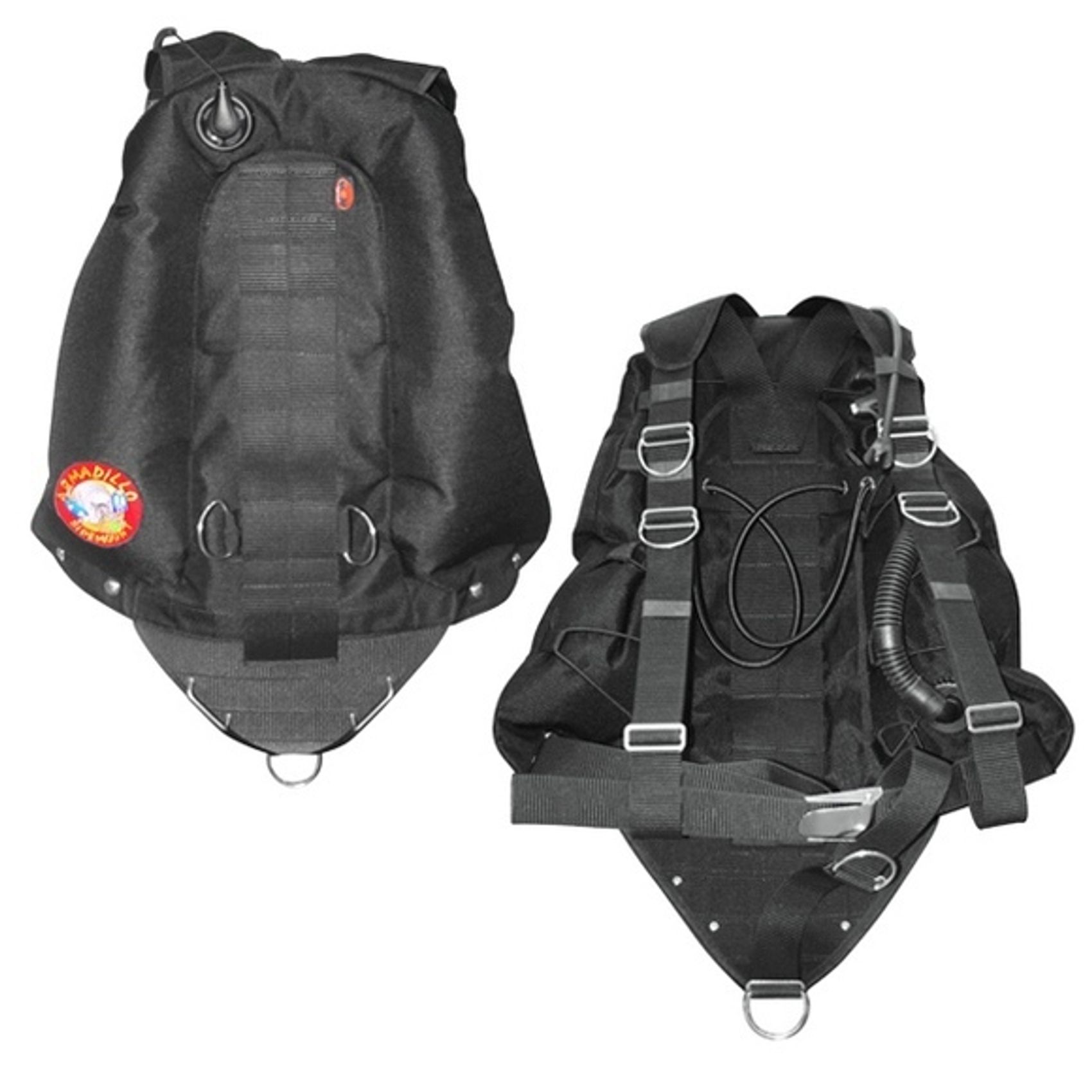 Сайдмаунт система плавучести Armadillo - пионер в области снаряжения для сайдмаунта. Armadillo - первая система для сайдмаунта, которая начала производиться промышленно. В течение десяти лет sidemount система претерпевала множество изменений, однако и по настоящий день, конфигурация сайдмаунт Armadillo является эталоном простоты и надежности как при сложных технических проникновениях в пещеры и затонувшие корабли, так и для рекреационного сайдмаунта открытой воды. Подвеска Armadillo позволяет осуществлять погружения не только в кофигурациии сайдмаунт, но и с обычным баллоном за спиной. Подвеска Armadillo имеет несъемную нижнюю палетту с рейлингами, Armadillo S комплектуется съемной паллеттой с рейлингами. Обе модели выполнены из материала Cordura 2000 den, комплектуются инфлятором с кнопками из нержавеющей стали, расположенным снизу и стравливающим угловым клапаном расположенным сверху. При необходимости инфлятор и стравливающий клапан могут быть поменяны местами. С внешней стороны на сайдмаунт системе имеется транспортная шлейка с D-кольцами для переноски баллонов за спиной. Шлейка легко отсоединяется поворотом D-кольца. Прорези на внешней стороне могут быть использованы для крепления баллонных ремней. Нижние карабины крепятся за рейлинги на нижней паллетте. Благодаря длине рейлингов карабины удобно пристегивать даже в толстых перчатках, что особенно важно при использовании стальных баллонов в пресной воде. При использовании алюминиевых баллонов в соленой воде, карабины могут быть перестегнуты на поясные D-кольца (опционально). Горловины баллонов удерживаюся эластичными жгутами. Дополнительные грузы могут располагаться как на плечевой, так и на поясной стропе. Так как шланг инфлятора для каждой сайдмаунт системы подбирается индивидуально, то в комплект он не входит. Система плавучести Armadillo sidemount не имеет с внешней стороны банжей (эластичных жгутов) и металлической спинки и идеально подходит для серьезных проникновений в узкие щели. Объем камеры 36 фунтов (17 кг) Система Armadillo выпускается компанией DUX для американского бренда Golem Gear
