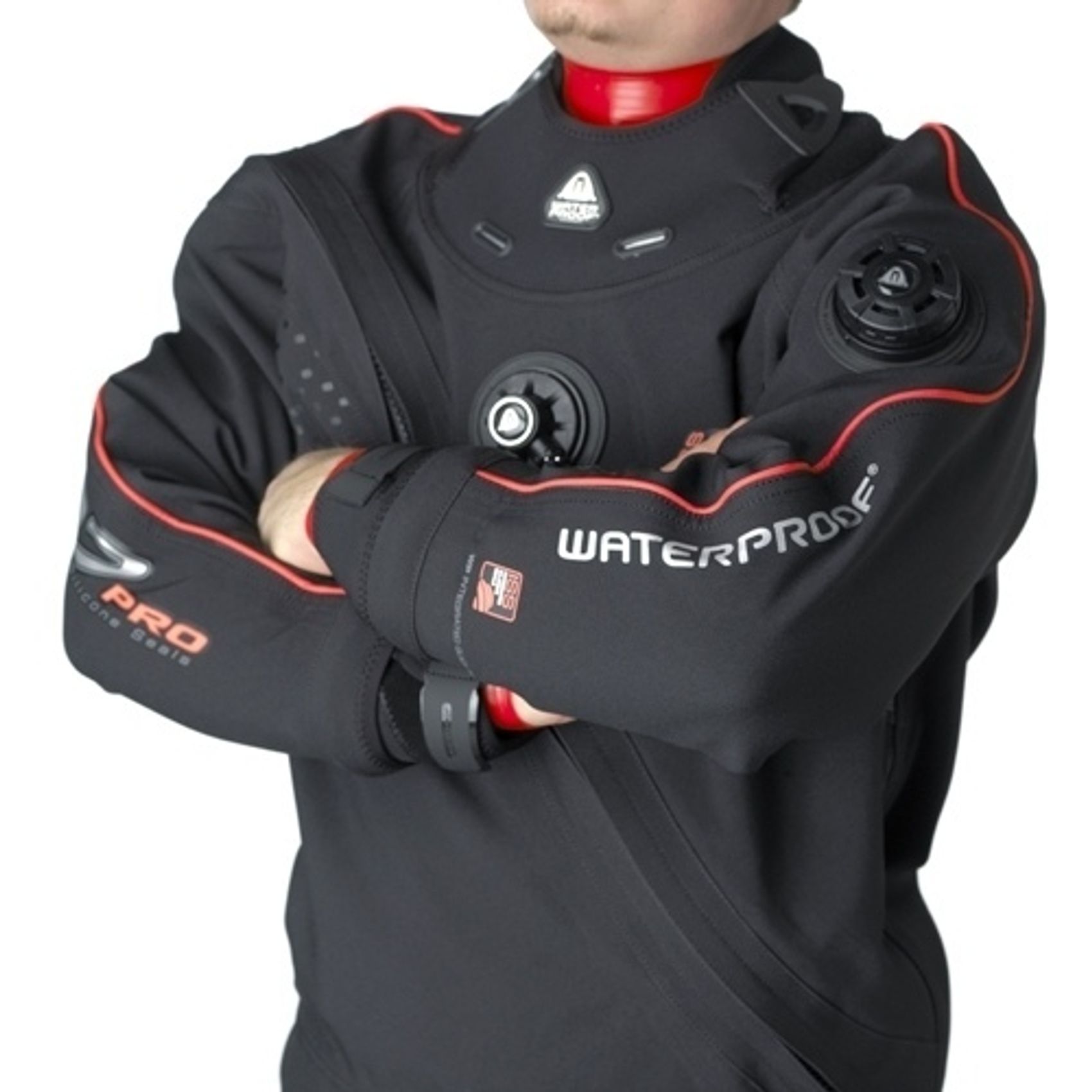 ВСТРОЕННЫЕ БЫСТРОЗАМЕНЯЕМЫЕ ОБТЮРАТОРЫ WP –Силиконовые обтюраторы на запястьях легко заменить благодаря специальному креплению при помощи новых быстросъемных коннекторов на овальных кольцах. Модель D7 PRO ISS оснащена новыми встроенными силиконовыми обтюраторами.